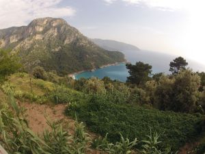 De wandeling wordt er niet minder prachtig van. Honderden meters lang lopen we door een natuurlijke kruidentuin die zichzelf in stand houdt tegen de zonnige hellingen: tijm, rozemarijn, salie in meerdere soorten, oregano. Je zou er trek van krijgen. Halverwege de wandeling steken we een volkomen droge beek over en lopen dan langs de andere wand van de vallei terug, richting strand van Kabak. Er is nog een mogelijkheid om een waterval te bezoeken maar die laten we aan ons voorbijgaan. Gezien de hoeveelheid water in de beek (0!!) lijkt ons dat geen imposante waterval te zijn.