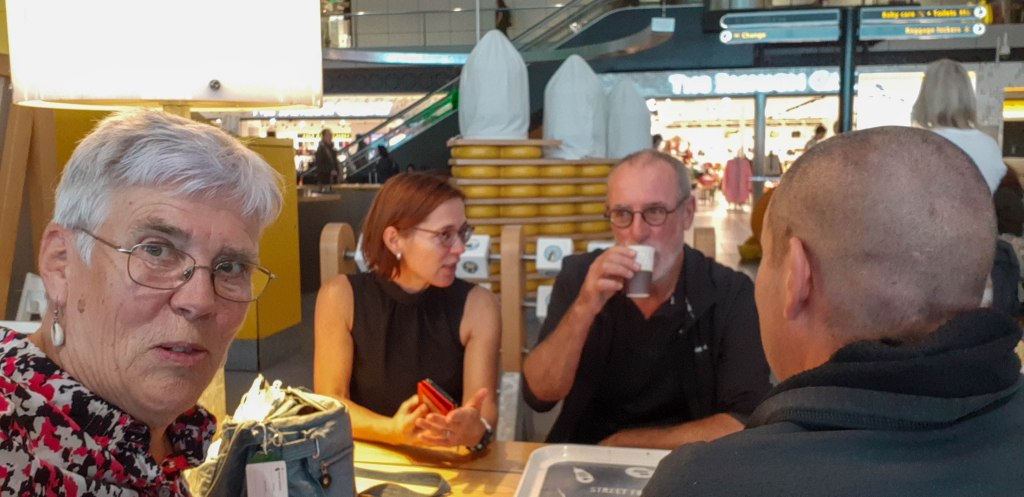 Keurig op tijd levert Freek ons vieren af op Schiphol. Het is druk, maar niet overmatig. In hal 3 staat een grote rij voor de incheckbalie van Singapore Airlines, maar is als rij herkenbaar, niet die geweldige onoverzienbare mensenmassa die we in de zomer in de kranten en op TV zagen.