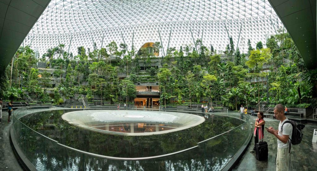 We willen graag naar de Gardens gaan in Singapore. Navraag op het vliegveld leert dat een enkele reis minstens een uur duurt, dat het zondag is, dat het druk is op de weg en zelf weten we dat het een groot complex is en dat je er wel een paar uur door moet brengen. Daar is 10 uur wachttijd dan weer net te kort. Dan maar naar Jewel. Ook indrukwekkend, een bouwwerkje van ongeveer 2 miljard, 6 verdiepingen hoog, en ook al die verdiepingen als tropische tuin ingericht met een gigantische waterval (Rain Vortex) vanaf 6 hoog én met een metro die het geheel doorkruist. Het mag wat kosten!