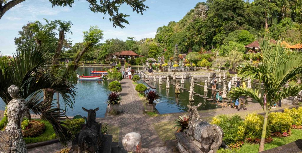 We beginnen de trip in Tirta Gangga (‘Water van de Ganges’ betekent dat, hoezo, we zijn op Bali?), een waterpaleis uit 1948, in 1963 verwoest door een uitbarsting van de Gunung Agung, maar nu weer in volle glorie. Die volle glorie geldt ook voor de karpers die in water leven. De 150 meter van parkeerplaats naar ingang van het park is aan beide zijden omzoomd door stalletje die visvoer verkopen. Voor 5000 IDR kun je de beestjes een hartvervetting bezorgen. Van alle aanwezige toeristen zijn we bijna de enigen die dit niet doen.