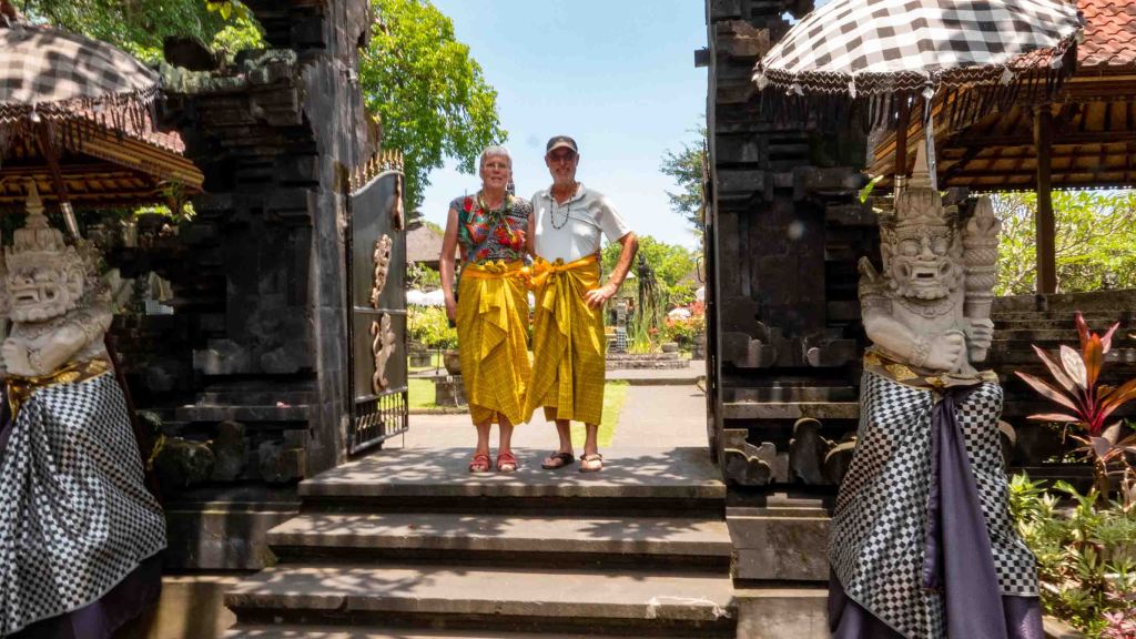 Weer in de auto en op weg naar de Goa Lawah tempel, een van de zes heiligste gebedshuizen op Bali. Een indrukwekkend gekkenhuis door het aantal toeristen, het minstens zo grote aantal verkopers en verkoopsters van allerlei prullaria, een complete gamelanband die even in rust is én een huwelijksceremonie precies voor de heilige opening van de vleermuisgrot. De offertjes en offers zijn niet aan te slepen, sommige deelnemers dragen een complete tafel naar binnen boordevol met bloemen, fruit, gekleurde papiertjes tot een gebraden kip aan toe! We kijken onze ogen uit.