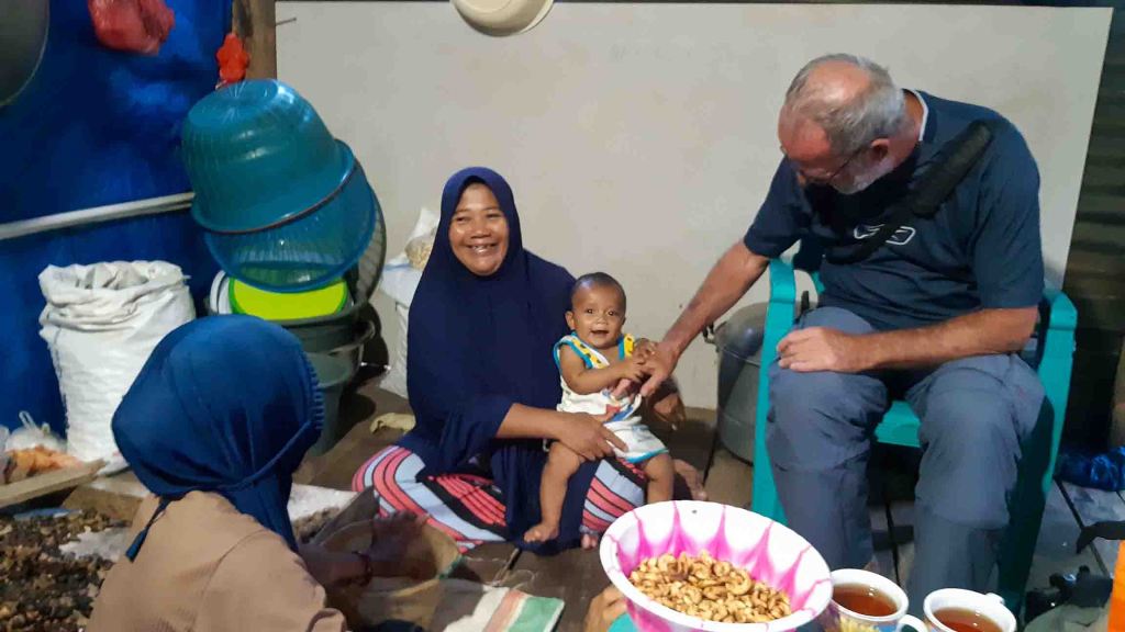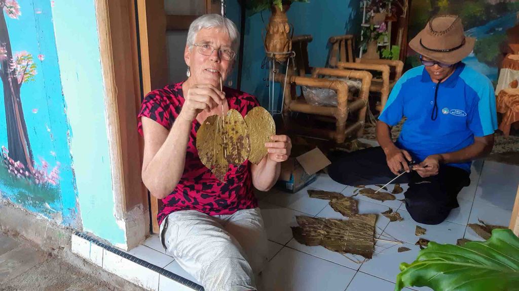 Na de grotten gaan we opnieuw de lunch gebruiken bij pak Rono. Hij is volop aan het koken als we aankomen. Vanmorgen is hij naar zijn akkertje geweest en heeft voor de koolhydraten deze keer gekozen voor traditionele knolgewassen: yam, zoete aardappel en (daar komt de huiskamervraag) ghova. Daarbij eten we ansjovis (rauw), een heerlijke vis in dunne kerriesoep en de bloemen van de banaan, op twee manieren bereid. Een manier is koken van de gehele bloem waardoor de binenkant er een beetje uit gaat zien als jackfruit. De andere is fijngesneden bloem en gekookt in kokosmelk. Heerlijk allemaal, opnieuw voedsel dat we nog nooit gegeten hebben en waar je al snel iets te veel van neemt omdat het zo lekker is. En we kunnen niet meteen aan een siësta (dat heet hier Tidur siang) want pak Rono gaat zijn vliegers showen. Hij is een van de weinigen in het dorp die de kunst van Kaghati nog beheerst. Gisteren is hij begonnen aan een vlieger als souvenir voor ons en hij nodigt Cockie uit om hem te helpen. Hij heeft al snel door dat zij de handigste is van ons twee. En dan gaat hij zijn eigen vlieger oplaten, die op het kleine zuchtje wind wat er is als een speer omhoog gaat, maar die wind is te weinig om hem in de lucht te houden. Vanmiddag maakt hij onze vlieger af en komt hem daarna naar ons hotel brengen.