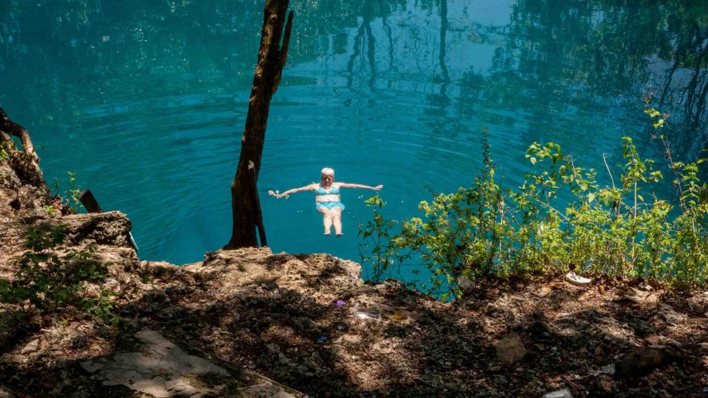 Dan is het even zoeken naar de lunchplek, Imim en Lativ zijn er een hele poos geleden geweest, een klein meertje dat in verbinding staat met de zee en waar onze gids (een ervaren duiker) aan grotduiken heeft gedaan. Na enig zoeken vinden we het idyllisch plekje en dat het in verbinding staat met de zee is te zien aan de trevally’s die er zwemmen. Cockie voegt zich daar onmiddellijk bij! Het fruit wordt gesneden en als borden dienen de grote bladeren van een teakboom. Met name de ananas is van superieure kwaliteit, het sap loopt langs je kin.