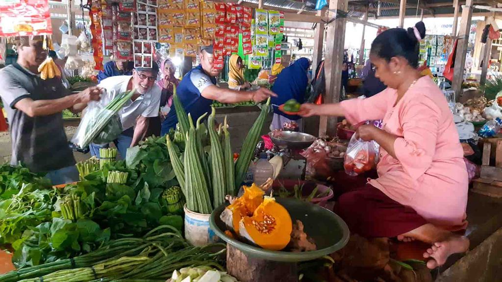 Volgende stop is de Pasar Sabho-Karaya Alam, een behoorlijk grote markt waar we inkopen doen voor het eten van vanavond. De lokale familie bij wie we slapen voelt zich bezwaard dat ze de gasten geen groenten kunnen voorzetten. Geen nood, zegt Imim, wij zorgen voor alles. Zoals altijd is een markt spekkie naar ons bekkie en de ‘hello mister’ is niet van de lucht.