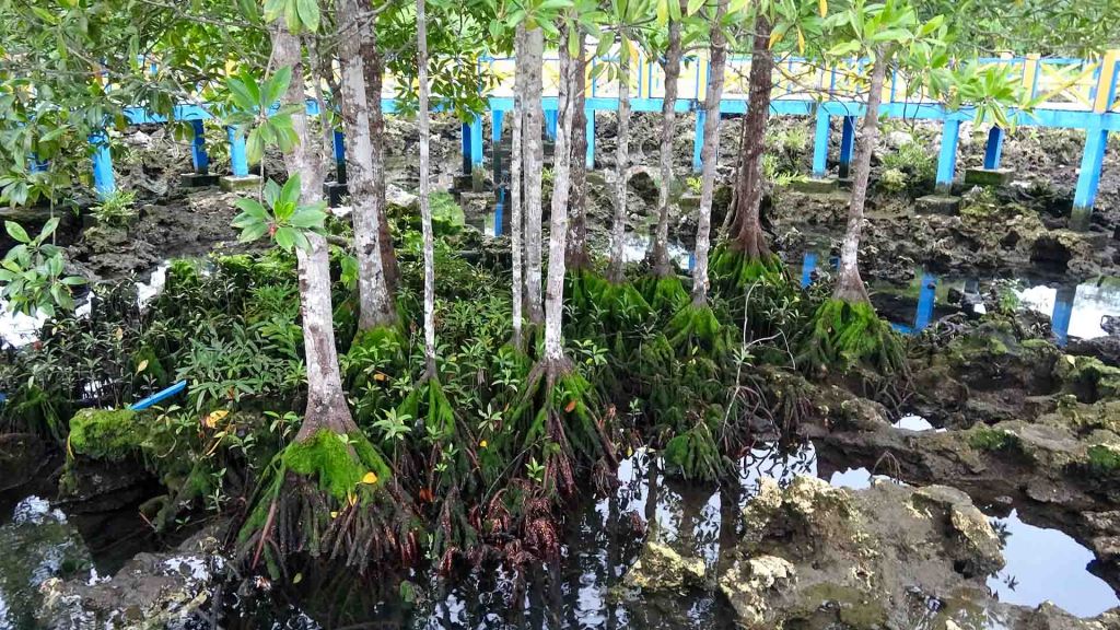 Terug aan land worden er gefrituurde snackjes gehaald en daarna gaan we een stukje wandelen. De omgeving is adembenemend mooi, de lokale bevolking heeft een soort boardwalk gemaakt die ze tot heilige plaats verklaard hebben. Er mag niets gevangen worden en dientengevolge voelen de vissen en andere dieren zich hier veilig, grote snappers zwemmen rond en nog veel meer. We genieten van de zonsondergang! Op de terugweg vraagt Cockie of hier ook kokosnootkrabben voorkomen. Dat is de trigger voor een nieuwe activiteit.