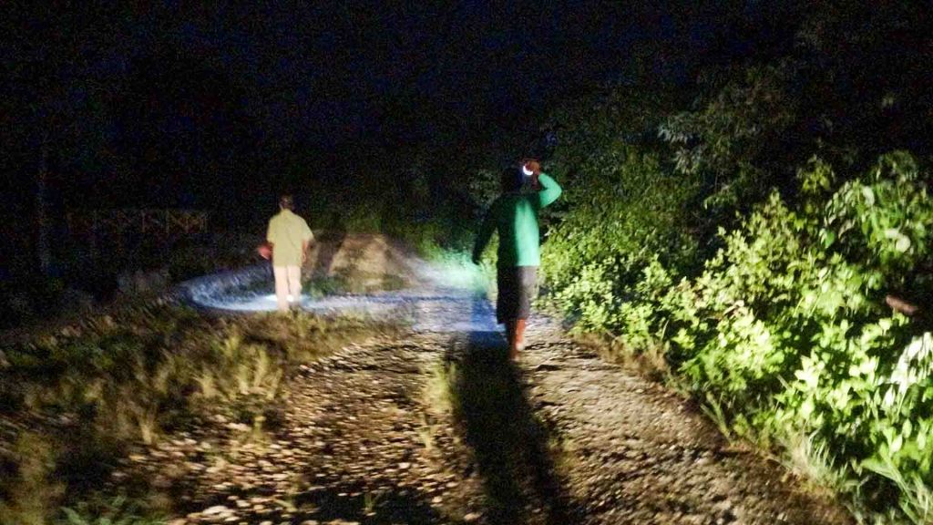 Na het eten gaan we kijken hoe het zit met de krabben. We zien drie verschillende soorten, maar de kokosnootkrab niet. Er gaan nog meer kansen komen| En dan naar bed, we zijn behoorlijk moe. In het huis van de familie waar we verblijven is een kamertje vrij gemaakt en daar is een matras op de grond gelegd ter dikte van twee kokosmatten, en zo voelt het ook! Niet zeuren, de rest van de familie ligt gewoon op de grond.
