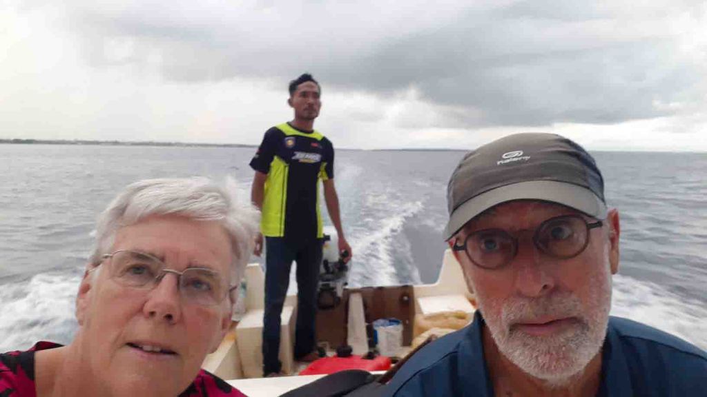 We zijn nog nooit zo ver uitgevaren, zegt Imim, normaal gesproken is er een kans van 9 op 10 dat je dolfijnen ziet. Er gaat nieuwe brandstof in de tank van de boot. Opgeven staat niet in ons woordenboek! En warempel, in de verte zien we een visser een vlieger oplaten. Niet veel later gevolgd door dolfijnvinnen boven wateren dan opeens, direct achter elkaar, twee dolfijnen die een gigantische sprong in de lucht maken. Dat willen wij ook wel doen, maar het bootje is tamelijk wankel!