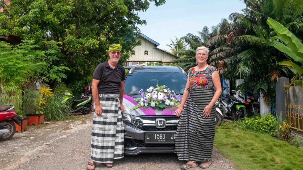Vooralsnog zijn wij het middelpunt van het gebeuren, dat moet het jonge stel straks nog maar zien te overtreffen. En zoals de trouwe volgers inmiddels begrijpen, we moeten weer op tientallen foto’s. De bruid en de bruidegom trouwen in drie stappen, eerst volgens de Adat, dan voor het burgerlijk wetboek (‘the state’) en tenslotte voor de religie (islam). Met dat laatste hebben de meeste mensen niet veel op, ze houden vast aan hun eigen tradities en religieuze opvattingen. Maar de staat eist nu eenmaal dat je een godsdienst kiest die in je paspoort geregistreerd wordt, dus nou ja, dan doen we wel moslim. En die islam is tamelijk invasief aanwezig, elk dorpje heeft zijn eigen moskee en elke moskee heeft zijn eigen luidsprekers die elke dag meerdere keren oproepen tot gebed. Een oproep kan moeiteloos een half in beslag nemen, beginnend om 4 uur in de ochtend en dan gedurende dag nog vier keer. Soms wordt de tussentijd gevuld met mummelend geprevel van de dienstdoende iman (waarschijnlijk vergeten de luisprekers uit te zetten). Ons resort staat precies binnen gehoorafstand van twee moskeeën die echter niet synchroon lopen in gebed. Tel uit je winst!