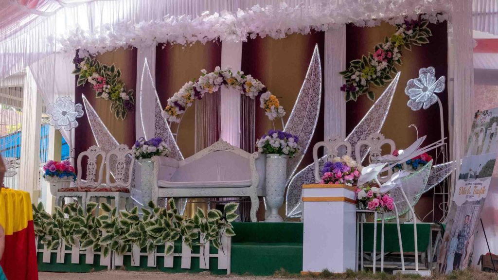 En dan gaan we achterop de brommertjes, een minuut of vijf brommen en dan zijn we in het volgende dorp. Bij het huis van de bruid hebben zich honderden mensen verzameld, mannen en vrouwen zitten gescheiden, wij krijgen een plaats aangeboden recht tegenover het podium waar straks bruid en bruidegom en de respectievelijke ouders komen te zitten. De kitsch van het geheel wordt bijna kunst!