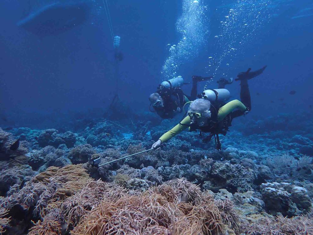 En dan moeten we weg, we hebben een duikafspraak om 11 uur. Ga nu niet weg zeggen mensen tegen ons, het eten komt er zo aan! Maar zelfs Cockie is daarmee niet te vermurwen, achter op de brommertjes en terug naar het resort. Wetsuits aan, booties aan en dan lopen we deze keer via een shortcut naar de haven. Gisteren zijn twee mensen uit Stuttgart aangekomen en Manfred gaat mee duiken, een krasse knar van bijna 80!