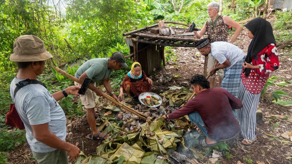 Tombole heet deze manier van voedsel bereiden. We eten het met schelpdieren en geroosterde vis. Als toetje worden er een paar verse kokosnoten uit de boom geplukt.