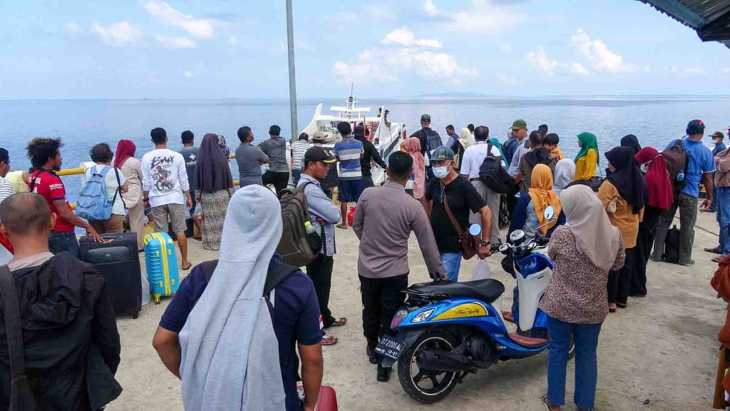 De boot heeft te veel diepgang, we worden een paar honderd meter uit de kust overgeheveld in een klein bootje. Van de passagiers zijn wij twee en een derde Indo met donkere zonnebril en hoodie de enige die hier van boord gaan. De rest vaart door naar Wangiwangi. Onze koffers en de tassen van de man worden in het bootje gezet (o.a. een mooie blauwe tas) en dan varen we richting kust. Maar zelfs dit kleine bootje kan niet tot bij de kust komen, de laatste 50 meter moeten lopend naar de kant (vandaar het bootie-advies!).