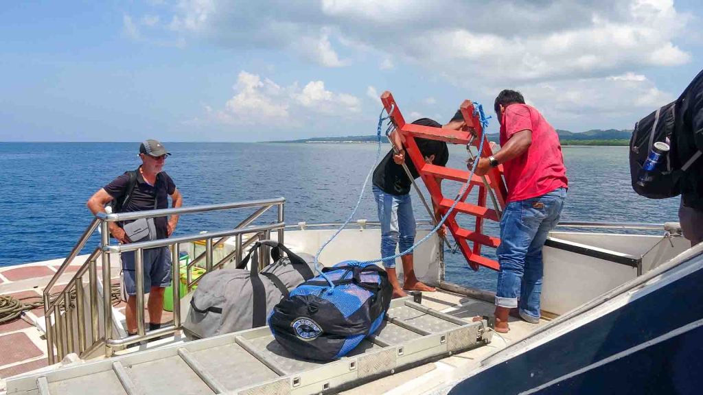 Vanmorgen zijn we met de boot vertrokken uit Tomia. Het is de Wakatobi lijndienst, vertrokken uit Binongko, ons opgepikt in Tomia en gaat ons afzetten in Kaledupa en vaart dan door naar Wangiwangi: de BiToKaWa-lijn. Onderweg worden er kokoskoekies en water uitgedeeld, dat hebben we nog niet eerder meegemaakt. Ons is geadviseerd om de duikschoentjes aan te trekken bij het verlaten van de boot.