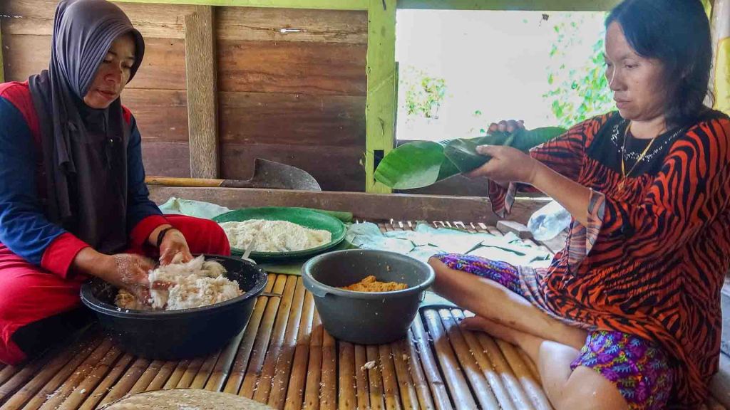 Daar zijn de vrouwen druk met de voorbereiding van de lunch. Ze hebben een bananenprak gemaakt die met cassavemeel gemengd wordt tot de dikte die ook gehaktballen hebben; de structuur lijkt er sprekend op, alleen is het wit. Er wordt nog wat suiker aan toegevoegd en dan wordt het als een soort grote burger ingepakt in bananenblad. In een andere kom wordt cassavemeel tot een dikke brei gekneed met ui, geraspte kokos en zout. Hiervan worden frikandellen gedraaid en in bananenblad verpakt. En dan gaan de pakketjes op gloeiend hete stenen, er word grond overheen gegooid en nu mag de hele zaak een klein uurtje garen.