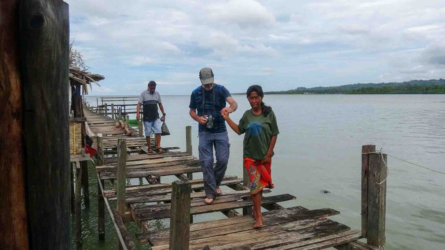 Hulp van de blindegeleidedienst bij het lopen over de planken