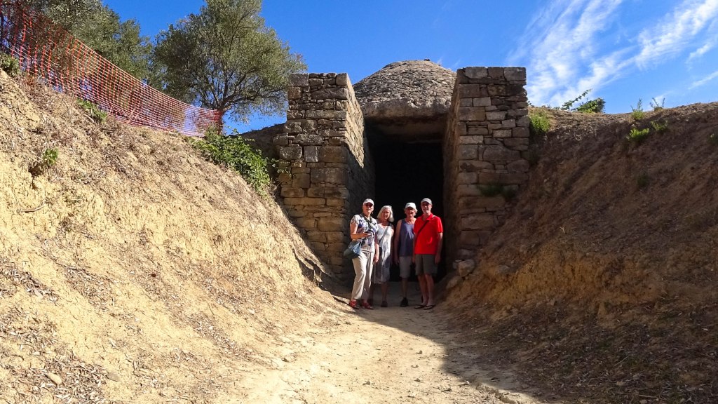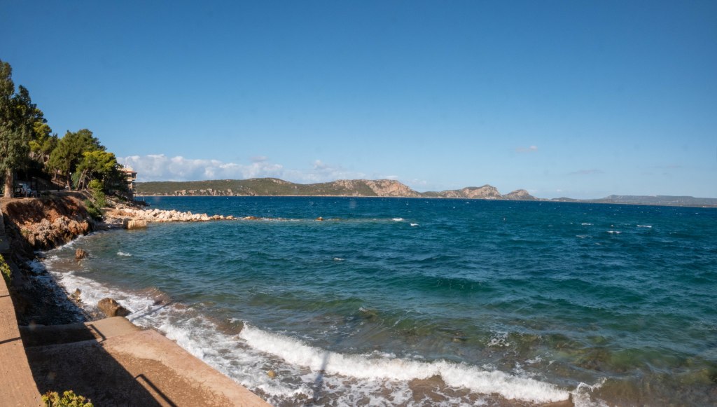 We vervolgen onze wandeling en komen bij de hoefijzervormige Voidokilia-baai. De zee dringt zich hier onstuimig naar binnen door een relatief kleine opening tussen de rotsen. Cockie kan het niet laten en gaat zwemmen in het kraakheldere water. Nou ja, zwemmen, de golven zijn hoog genoeg om zwemmen moeilijk te maken en dobberen makkelijk.
