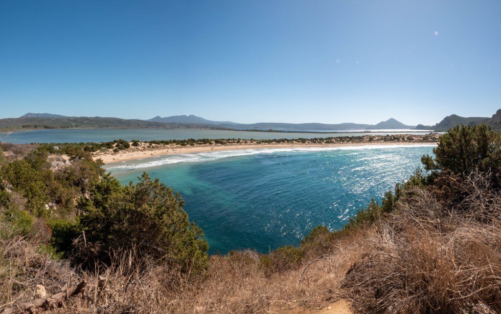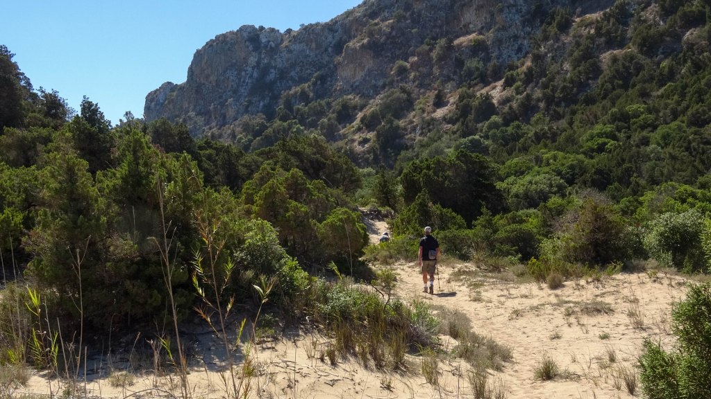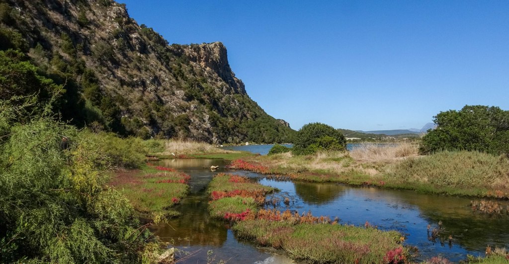 De terugweg voert door een prachtig duingebied, met aan de rechterhand steile rotsen en aan de linkerhand het moerasgebied. Het pad wordt smaller, de rotsen komen dichterbij en het prachtig roodkleurende Zeekraal vormt de grens met de lagune.