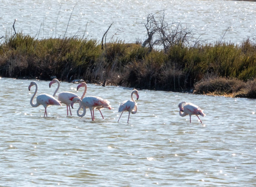 We zijn nog niet goed en wel uit de auto of de eerste IJsvogel meldt zich alweer, iets verderop staan verschillende groepen Flamingo’s, langs het pad groeit en bloeit nog van alles. Kortom, de bioloogjes genieten volop.