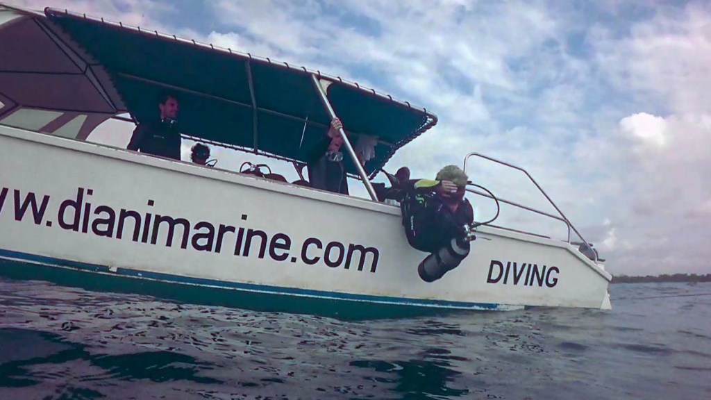 Dan moeten de wetsuits aan, vesten aan, vinnen aan, lood omhangen, vest opblazen, op de rand van de boot gaan zitten en dan met een backroll het water in. Hand op duikbril en ademautomaat, en hop, daar gaat Coen, of ie nooit iets anders gedaan heeft.