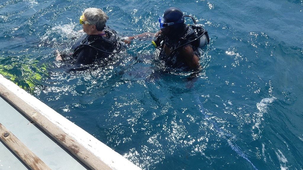 Zwemmen naar het ankertouw, goed vasthouden en dan langzaam de daling inzetten. Dat gaat met een beetje moeite, de druk op de oren komt bij dieper gaan terug, dus weer een stukje naar boven en opnieuw proberen. Uiteindelijk lukt het en blijven 45 minuten onder water, soms aan de hand van de duikgids, maar ook regelmatig zelfstandig zwemmend.