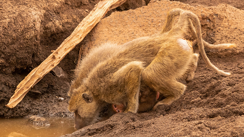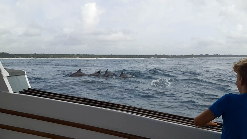We zijn nog geen 5 minuten onderweg of er dient zich een grote groep dolfijnen aan. Ze zwemmen met de boot mee, buitelen vrolijk in en uit het water, alsof ze de jonge duiker komen begroeten.