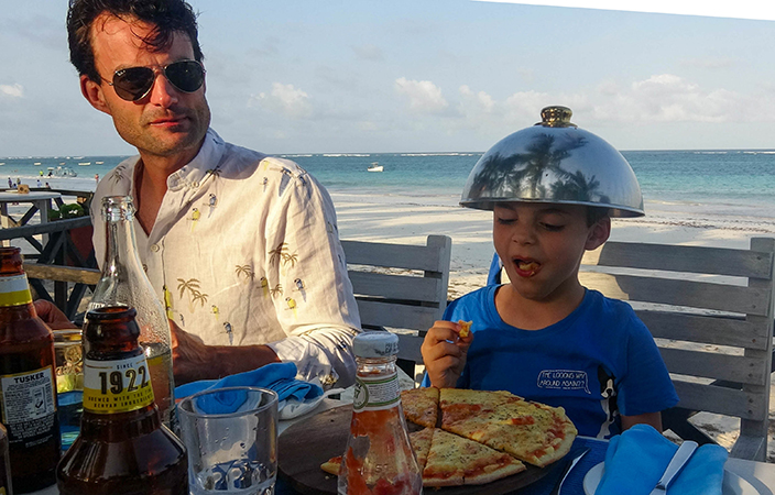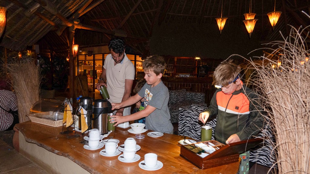 Om half 4 gaan we richting restaurant en maken de jongens prachtige bouwwerken van zand. Lekker eten met uitzicht op de Grote Oceaan. We hebben weer een heerlijke dag gehad.