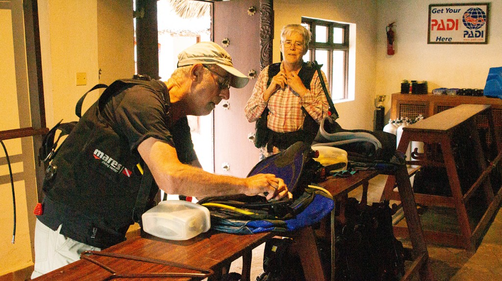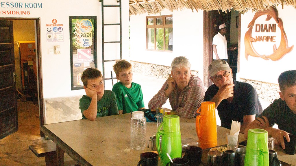Om 8:00 uur zitten Freek, Anne, Paul en Coen bij de duikbriefing. Jawel, Coen gaat mee de diepte in, hij mag niet dieper dan 12m en krijgt een eigen duikgids mee, Suleiman. De tassen met trimvesten en ademautomaten worden aan boord gebracht, de flessen staan er al en ‘off we go’.