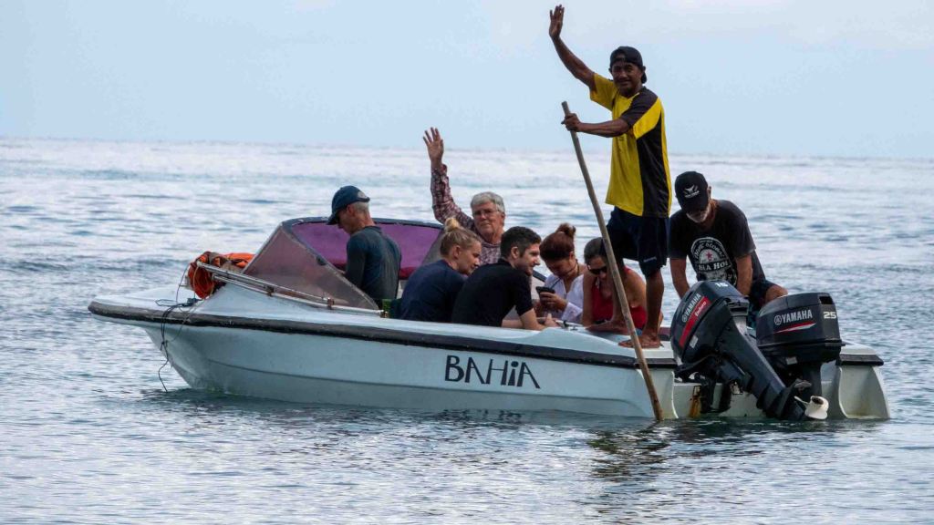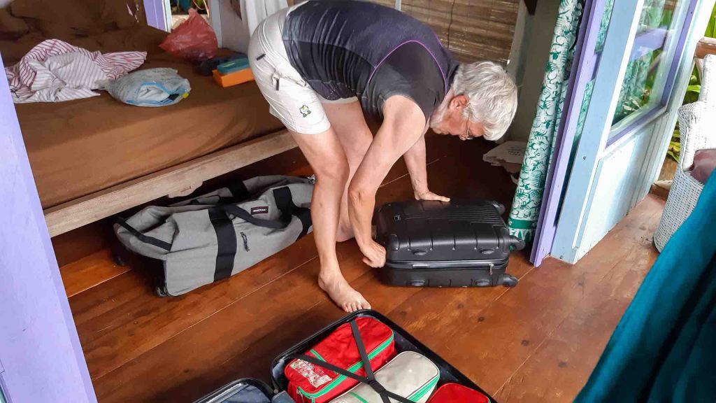 Als we terugkomen staat de ontbijttafel al klaar: gemengd fruit, mangosap, koffie, thee, geroosterd brood, pannenkoekjes, twee soorten jam, chocopasta, omelet, gebakken aardappels, worstjes, bacon; het kan niet op!